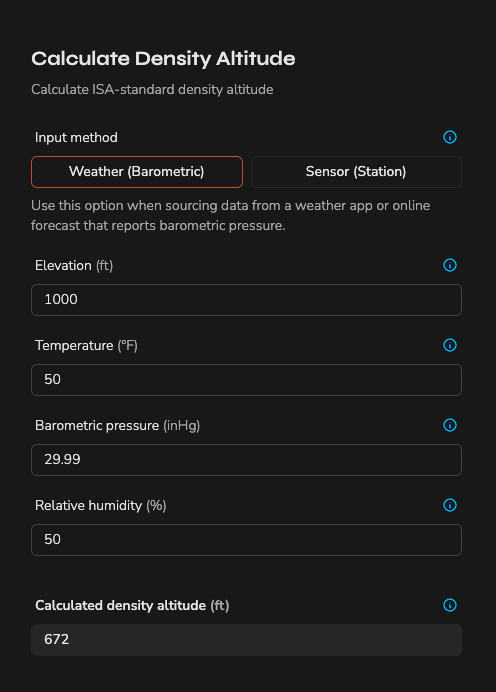If you have a field weather meter, but it does not provide a density altitude reading, you can use our calculator to determine the density altitude based on the sensor's readings.