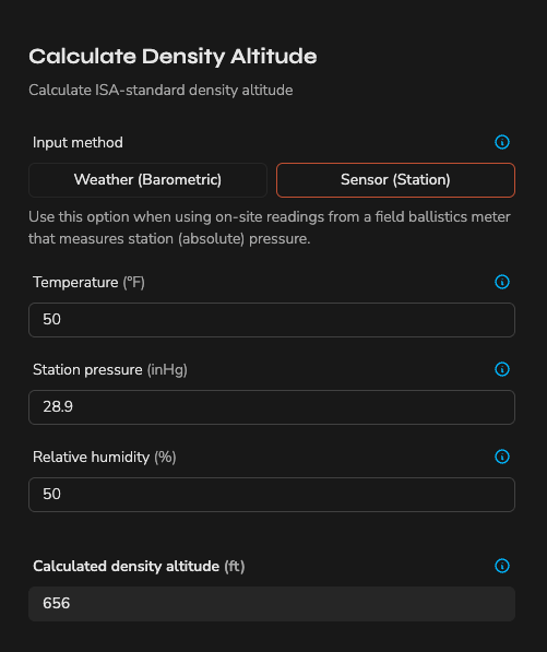 When creating sight tapes, mark sheets, etc., you have the option to adjust this density altitude for remote destinations. For example, maybe you are traveling for a shoot and want to create a sight tape for that location's air density ahead of time. In this case, on the sight tapes page, you would enter the destination's density altitude.