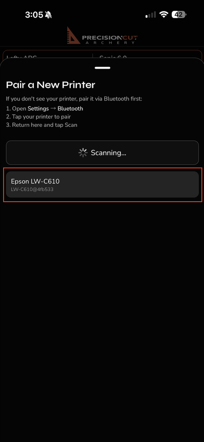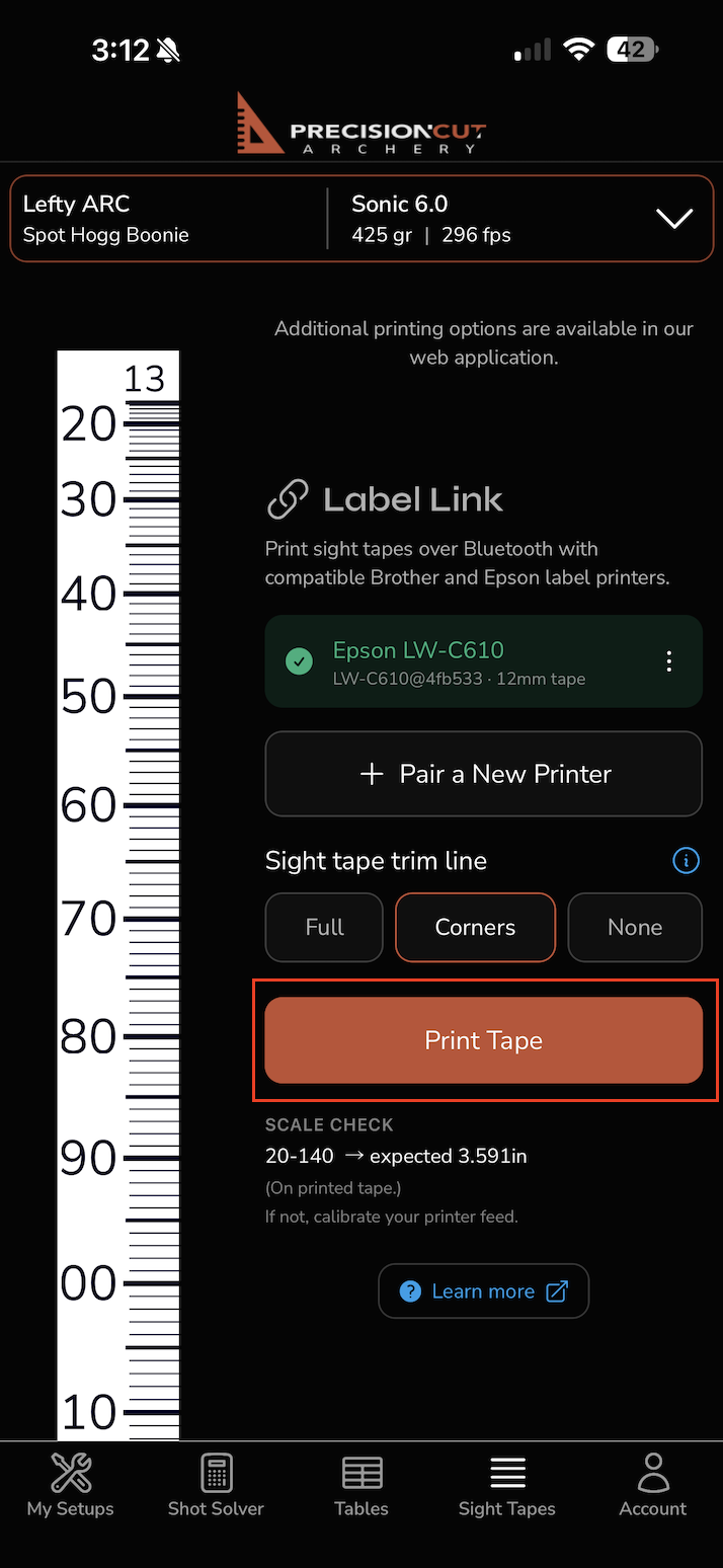 Label Link prints sight tapes directly from your PCA mobile app to a compatible Epson or Brother label printer over Bluetooth. No desktop computer, no PDF documents, no manual scaling in a third-party app.