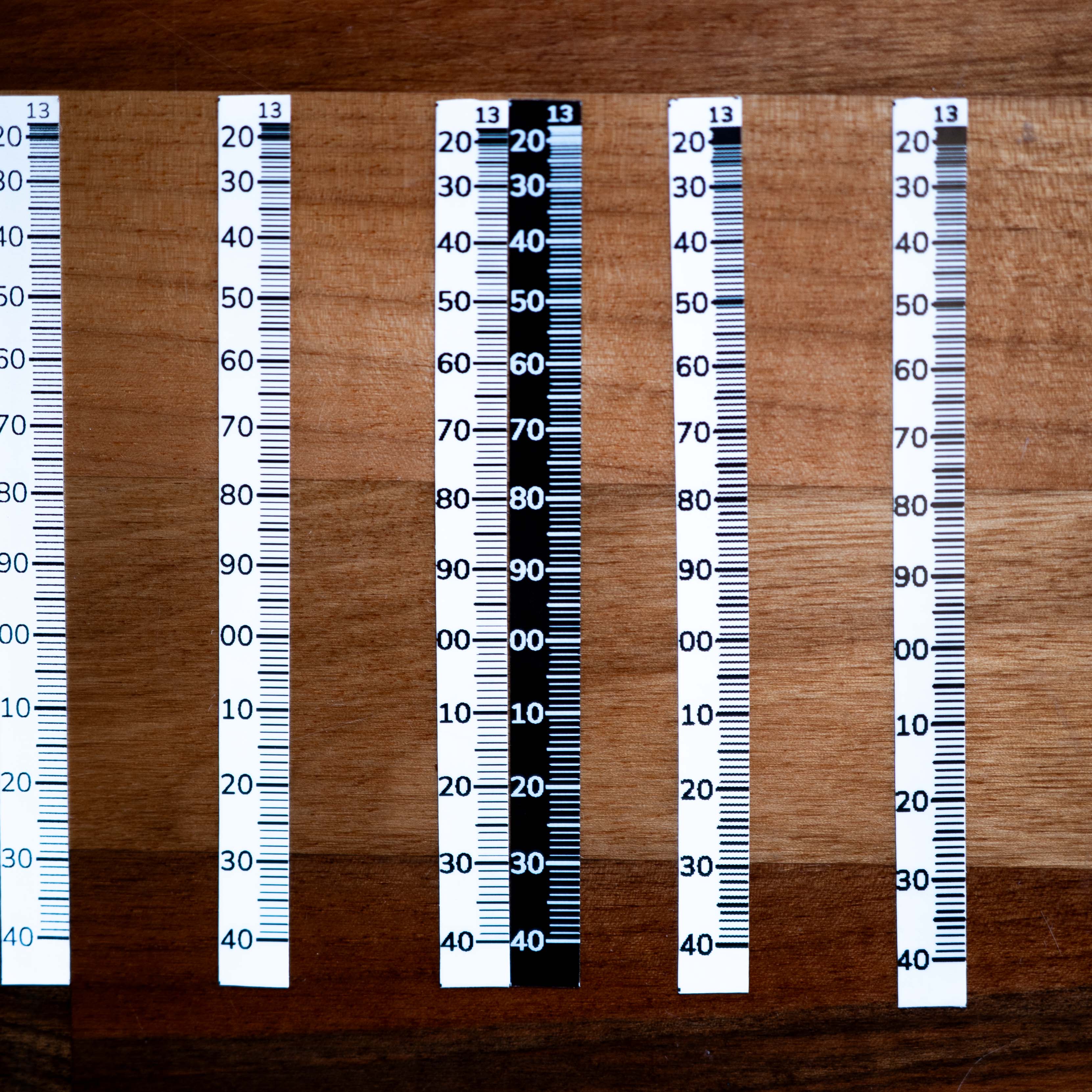 Here's the same exact sight tape printed on each of the four printers, side-by-side, so you can see how resolution affects legibility.