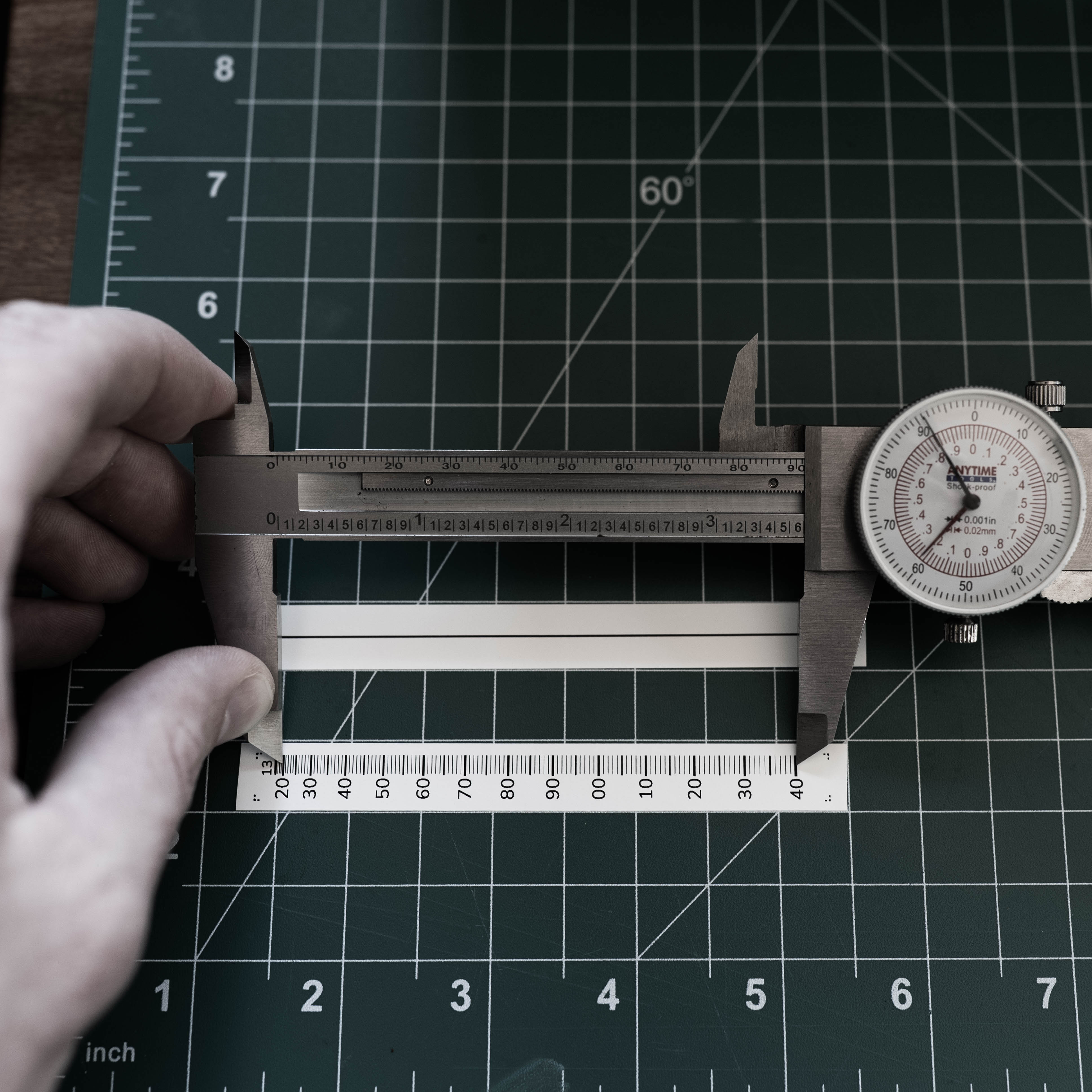 Sight tapes need to print at an exact size to be accurate. Label cartridges feed slightly differently from unit to unit, and the feed rate changes slightly as the roll is used up. A quick calibration corrects for this so every tape comes out at the right scale.